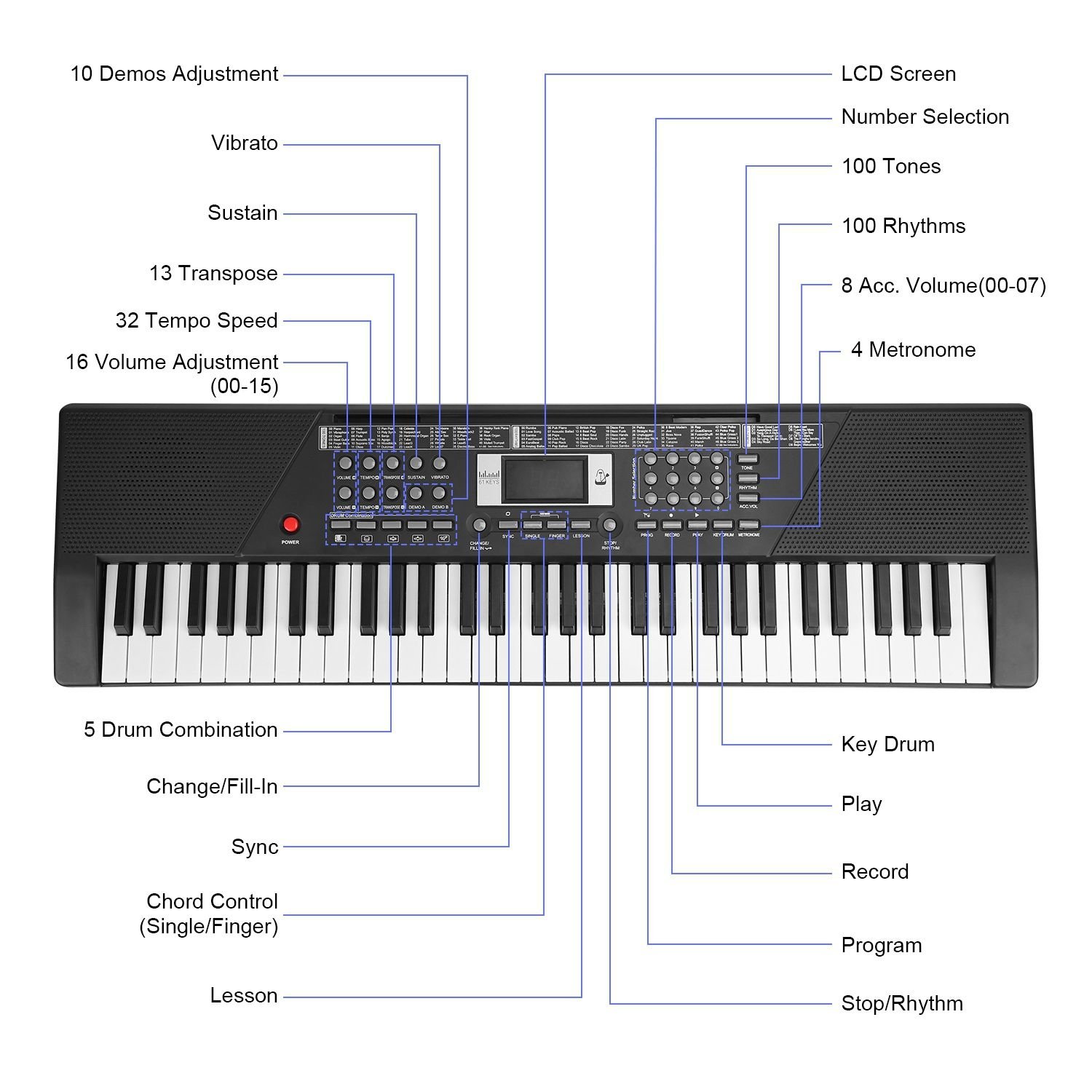 *Multifunctional 61-Key Piano Toy*:There are multi-function for this piano toy:100 Tones,100 Rhythms,60 Demos,32 Tempo Speed,Recording,16 Volume Adjustment(00-15),13 Transpose,5 Drum Combination,Sustain,Vibrato,Follow,Microphone,Sync,Chord Control(Single/Finger),Fill-in,Program,Recording,Dual Key,LED Key and so on. You can see your selection in the HD screen.