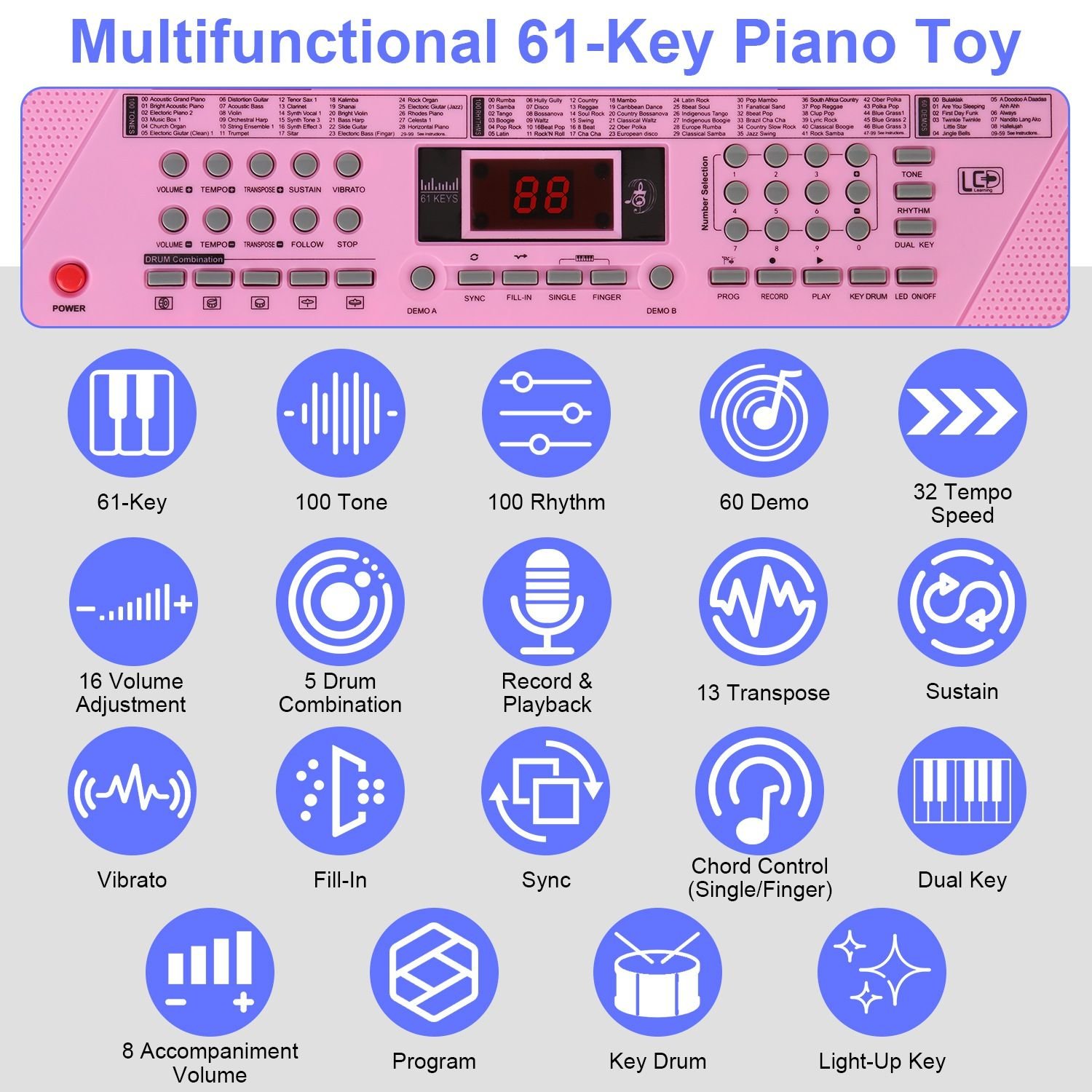 *Multifunctional 61-Key Piano Toy*:There are multi-function for this piano toy:100 Tones,100 Rhythms,60 Demos,32 Tempo Speed,Recording,16 Volume Adjustment(00-15),13 Transpose,5 Drum Combination,Sustain,Vibrato,Follow,Microphone,Sync,Chord Control(Single/Finger),Fill-in,Program,Recording,Dual Key,LED Key and so on. You can see your selection in the HD screen.